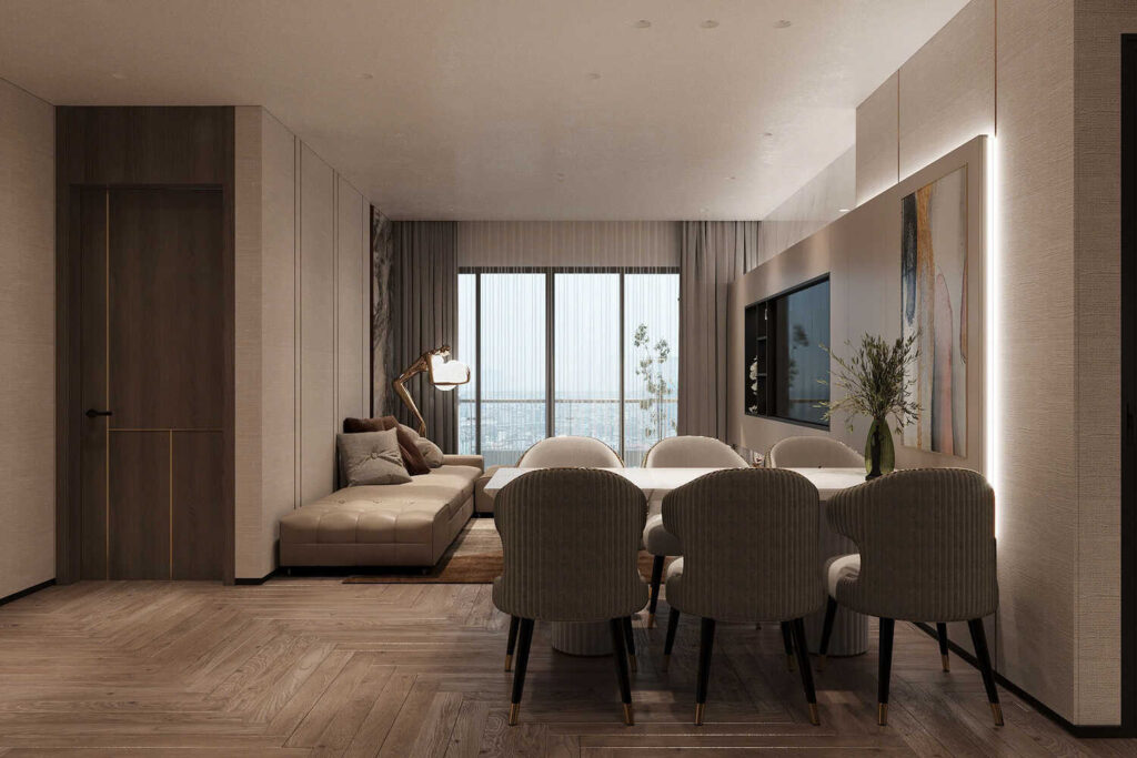 Bên trong căn hộ, các không gian được phân chia hợp lý, tối ưu hóa diện tích sử dụng nhưng vẫn giữ được sự thoải mái. Tầm nhìn hướng ra cảnh quan xanh mát đem lại cảm giác thư thái sau mỗi ngày làm việc.